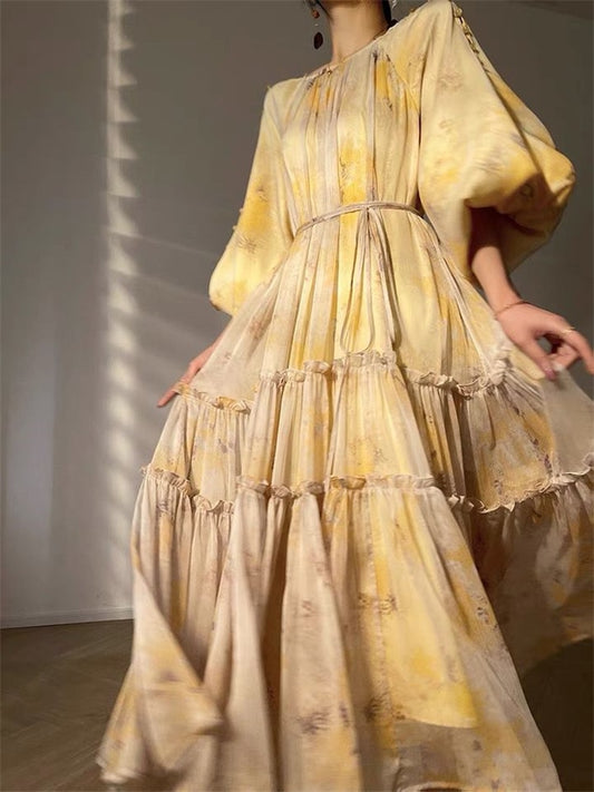 Botvotee Print Midi Dress for Women 2023 Fashion Vintage Casual Lantern Sleeve Dresses Elegant Long Sleeve O Neck Loose Dress