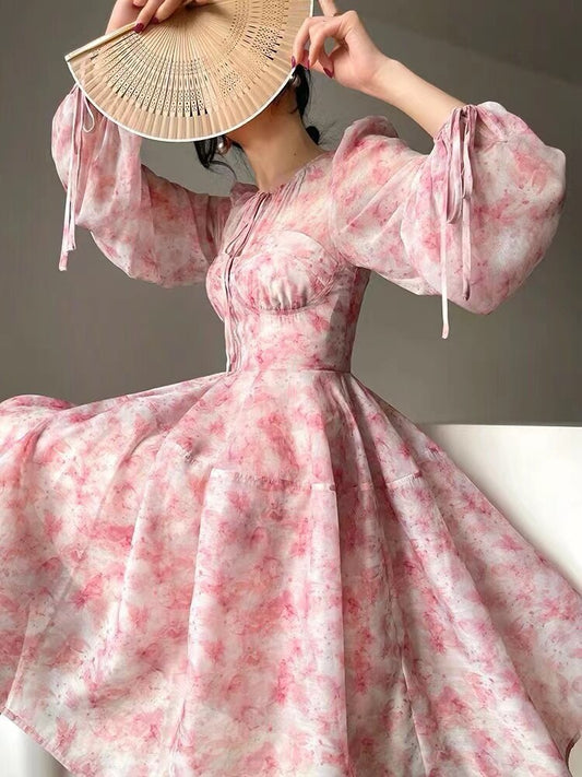 Botvotee High Waisted Print Dress for Women 2023 New Fashion Elegant Long Sleeve A Line Dress Vintage O Neck Lace Up Midi Dress